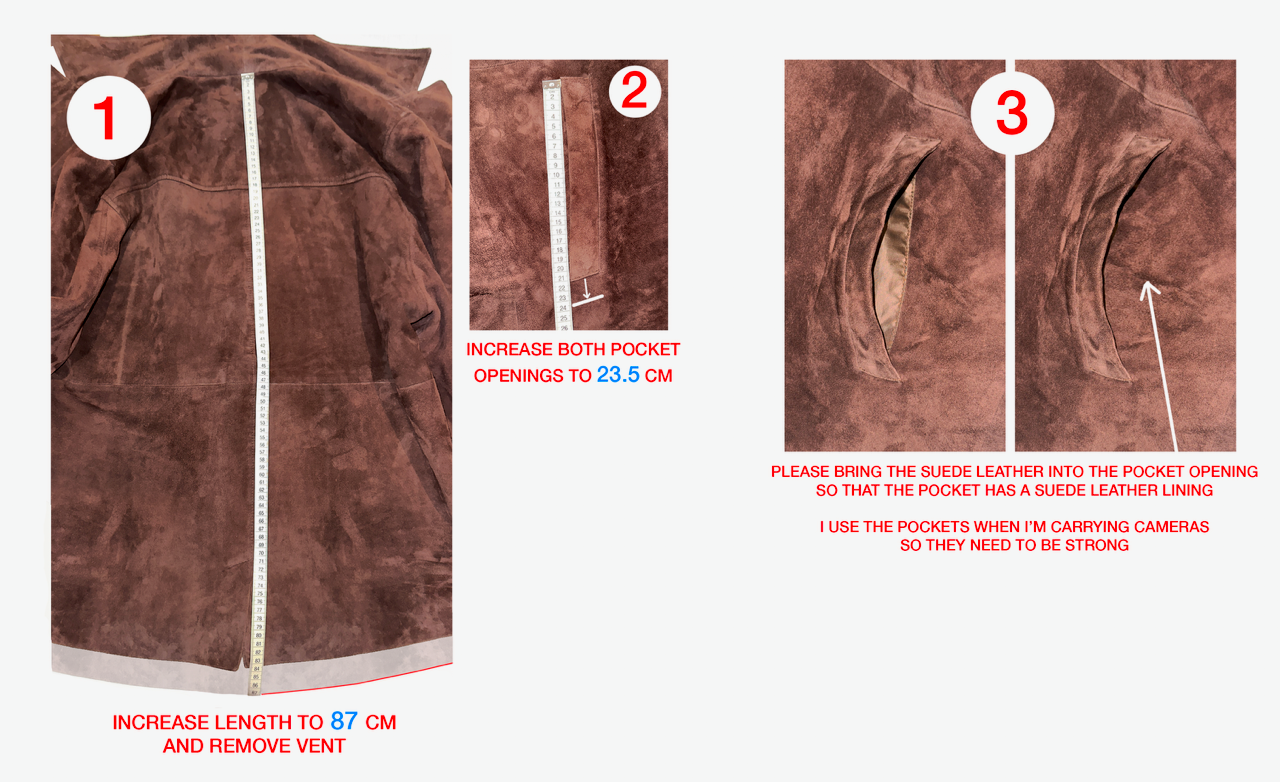 1:  Increase the length of the jacket and remove the vent at the back  (see details on the picture)