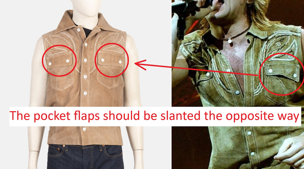 • Outside Pockets: 2 chest flap buttoned pockets (button with button hole) (no waist pockets)