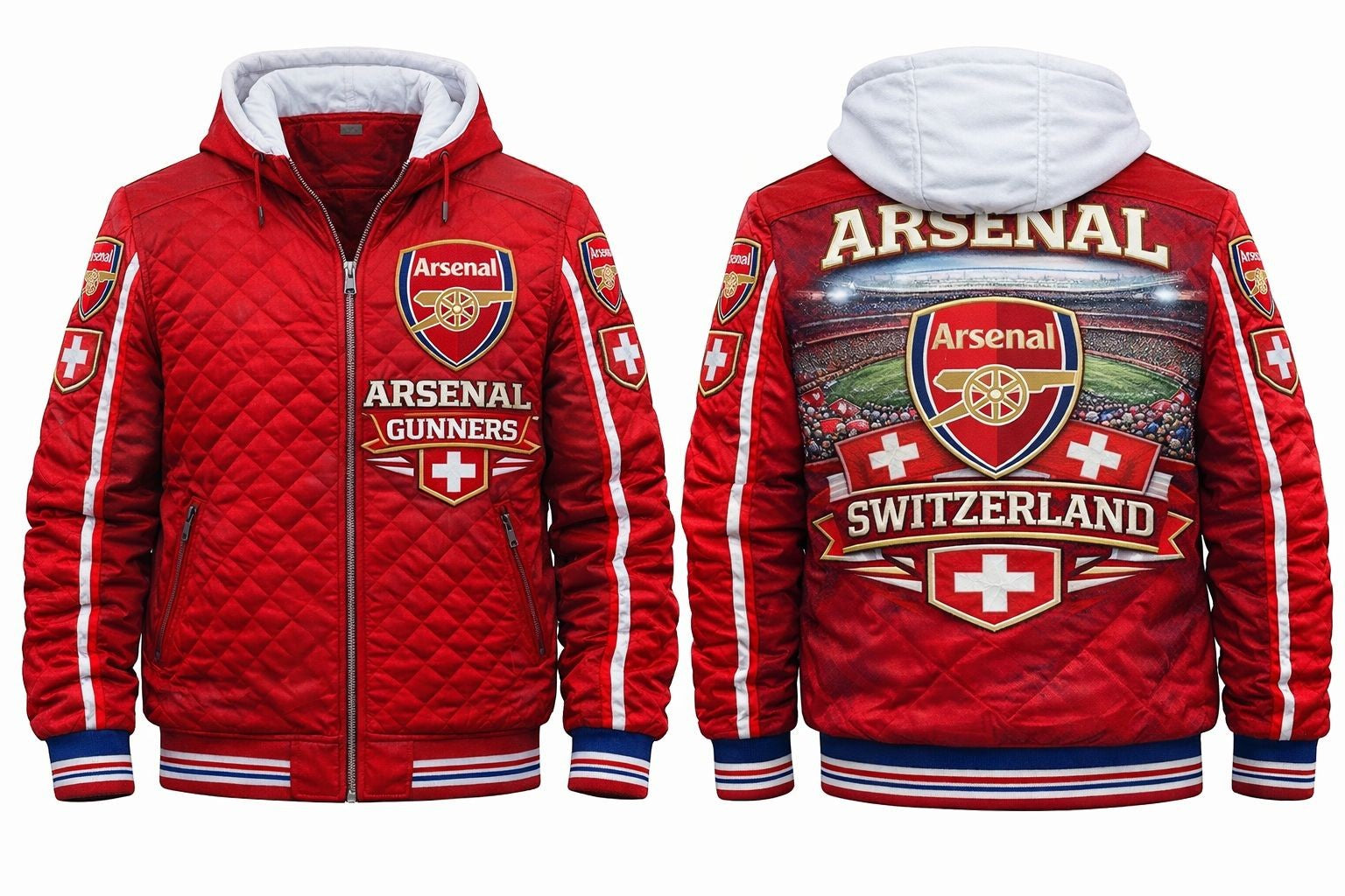 • Inner Shell: Quilted polyester in blue, and hood to have red lining